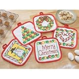 Herrschners , Herrschners Exclusive! Set of 5. Delightful pot holders stamped for cross-stitch on pre-quilted white polyester/cotton fabric with red bound edges. Includes instructions. Approximately 8 x 8" (20.5 x 20.5cm). For decorative use only. Made in U.S.A.