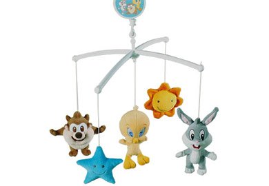 Baby King , Complete your baby's nursery with this Baby Looney Tunes Musical Mobile! This new style also includes a wall mounting feature for extended use. This mobile features three bright and colorful Looney Tunes characters (baby Tweety, baby Taz and baby Bugs Bunny) and two objects (a sun and a star) to keep your child happily distracted as he/she drifts off to sleep. The mobile includes one set of cross arms, one music box and one mobile upright crib attachment wheel. Safely fits all standard and most convertible cribs.